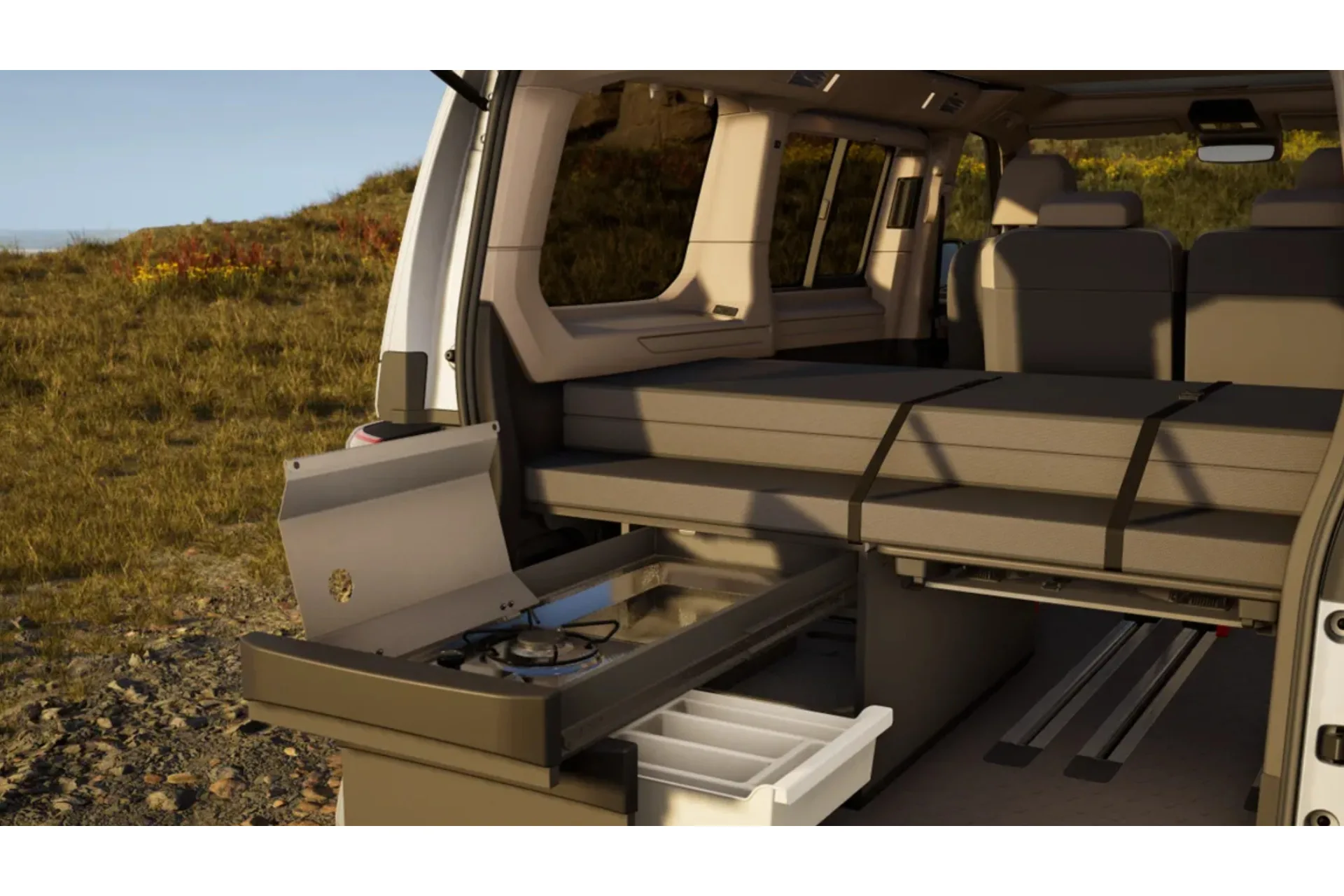 Het hart van deze Beach Camper ligt achterin. De keuken in de achterklep verplaatst het leven naar buiten en maakt van elke stop een moment. Koken met uitzicht, eten in de open lucht en direct weer vertrekken wanneer de dag daarom vraagt. Dit is geen kampeeroplossing, maar een manier van reizen die draait om betrokkenheid met de omgeving.